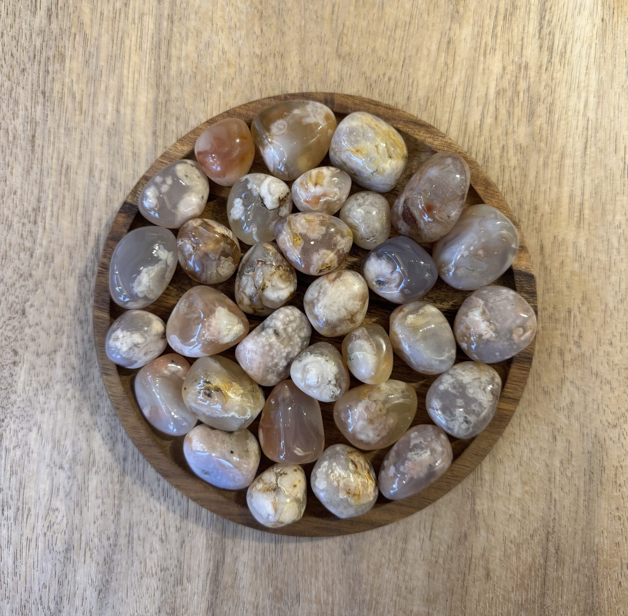 Bloemagaat is meestal zacht van kleur van roze of beige en bevat lichte chalcedooninsluitsels en deze lijken op bloemetjes. De Bloemagaat werkt op een zachte, rustgevende en voedende energie. Is kalmerend, troostend en opbeurend. Deze steen helpt je om stress, zorgen, angsten en spanningen los te laten en verzacht emotionele pijn en oud zeer. Omdat deze steen helpt om negatieve emoties en spanningen los te laten, geeft het lucht en maakt ruimte voor positieve veranderingen, optimistisch, (eigen)liefde en groei. Bloemagaat is een aardende, beschermende en kalmerende steen. Hij staat voor groei en helpt je dromen waar te maken en deze met passie en toewijding te manifesteren en het leven ten volle te leven. Heeft een troostende werking en stimuleert geluk. Deze steen heeft ook een vrouwelijke energie, wat het gevoel brengt van veiligheid en om thuis te zijn. Verwijdert negativiteit in een ruimte. Harmoniseert yin en yang en breng energieën in evenwicht.