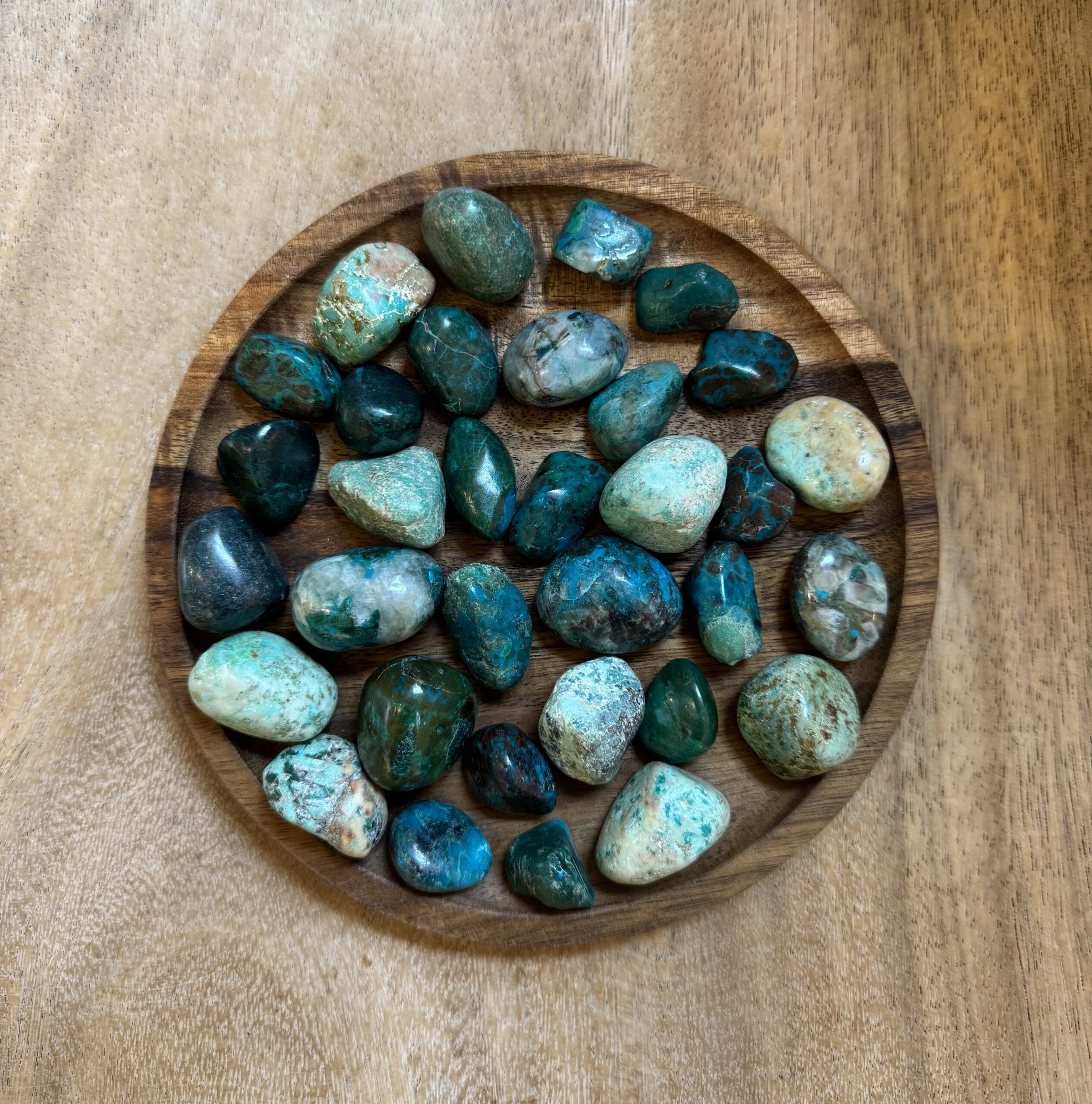 Chrysocolla zorgt voor balans, kalme energie en innerlijk evenwicht. Werkt kalmerend of activerend al naar gelang wat nodig is in een bepaalde situatie. Als een persoon weinig energie heeft en zich futloos voelt, werkt het activerend en geeft kracht en zet aan tot handelen. Als een persoon nerveus of gespannen is, werkt deze steen kalmerend en verlicht overprikkeling en stress. Deze steen zet aan tot zelfreflectie, stimuleert een neutrale en open houding en laat de waarheid naar boven komen. Chrysocolla opent je keelchakra en stimuleert om je innerlijke wijsheid helder te communiceren. Het brengt ook je hartchakra in harmonie en evenwicht waardoor je beter vanuit je hart durft te spreken en je gevoelens te uiten. Chrysocolla is een uitstekende steen voor personen die les geven, individueel en aan kleine en grote groepen. Het helpt iemand toegang te krijgen tot hogere rijken van kennis en die wijsheid vrijelijk met anderen te delen. Het houd het hoofd koel en helder wanneer er (communicatieve) verstoringen zijn in het klaslokaal.