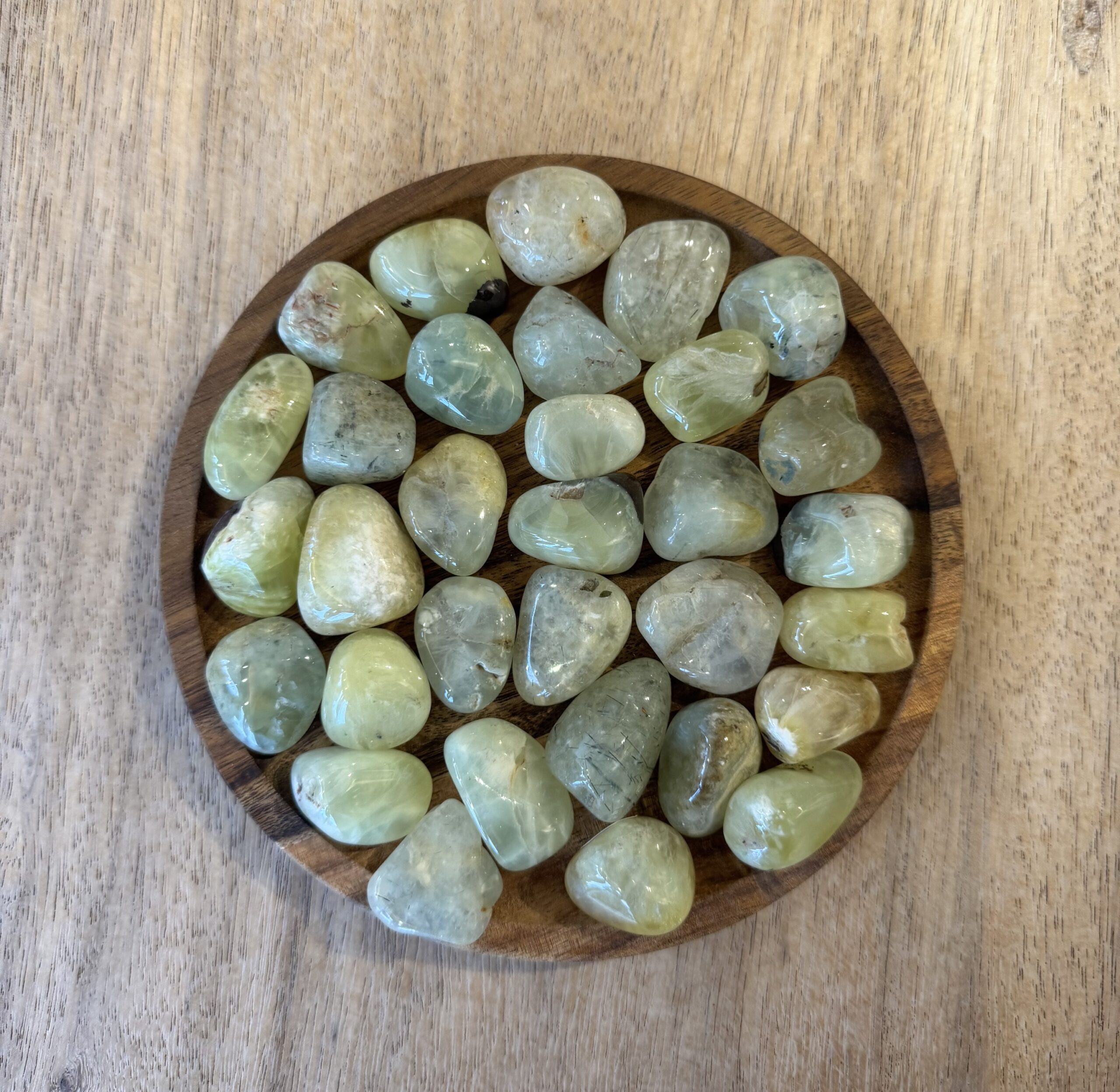 Verzorging van Prehniet: Prehniet is een gevoelige steen die het best met zorg behandeld kan worden. Vermijd water en zout bij het reinigen. Kies liever voor een zachte reiniging met de rook van witte salie of palo santo of leg de steen op een bedje van Hematiet of een cluster van Amethist.