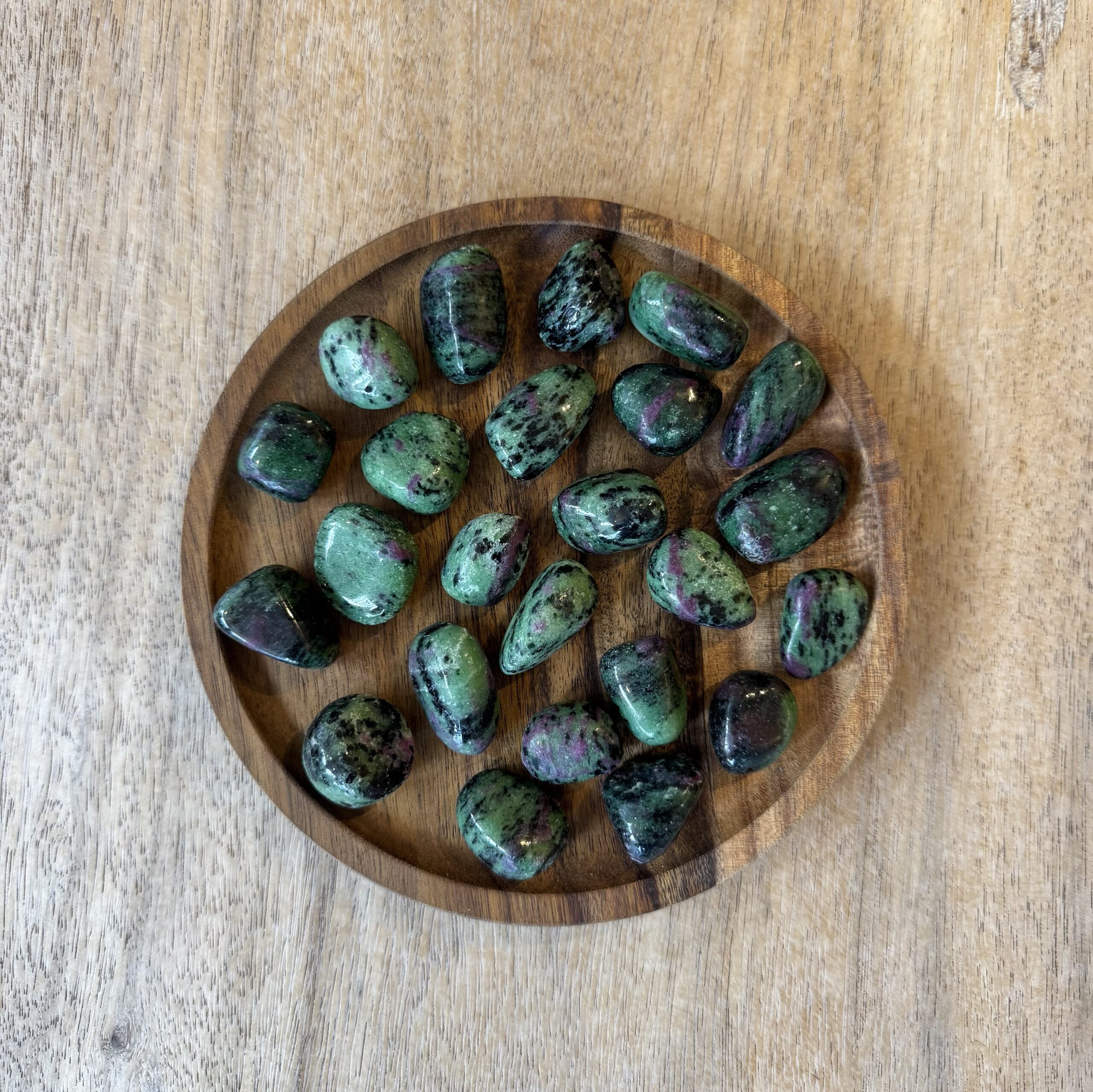 Robijn is een steen die je met hartstocht laat leven. Een steen die levenskracht geeft en een fijn en jong gevoel geeft. Zoisiet is een steen die je energie geeft en ondersteunt in je groei als mens en inzicht in het leven. Daarom is deze combinatie zo mooi en die zorgt voor een fijne magie en helpt je met het ontwaken van wie je werkelijk bent en biedt de kracht en de wil om jouw dromen te verwezenlijken. Deze steen kan verborgen gevoelens naar boven brengen en bevordert de creativiteit. Robijn in Zoisiet kan negatieve energieën omzetten naar positieve positieve energieën.