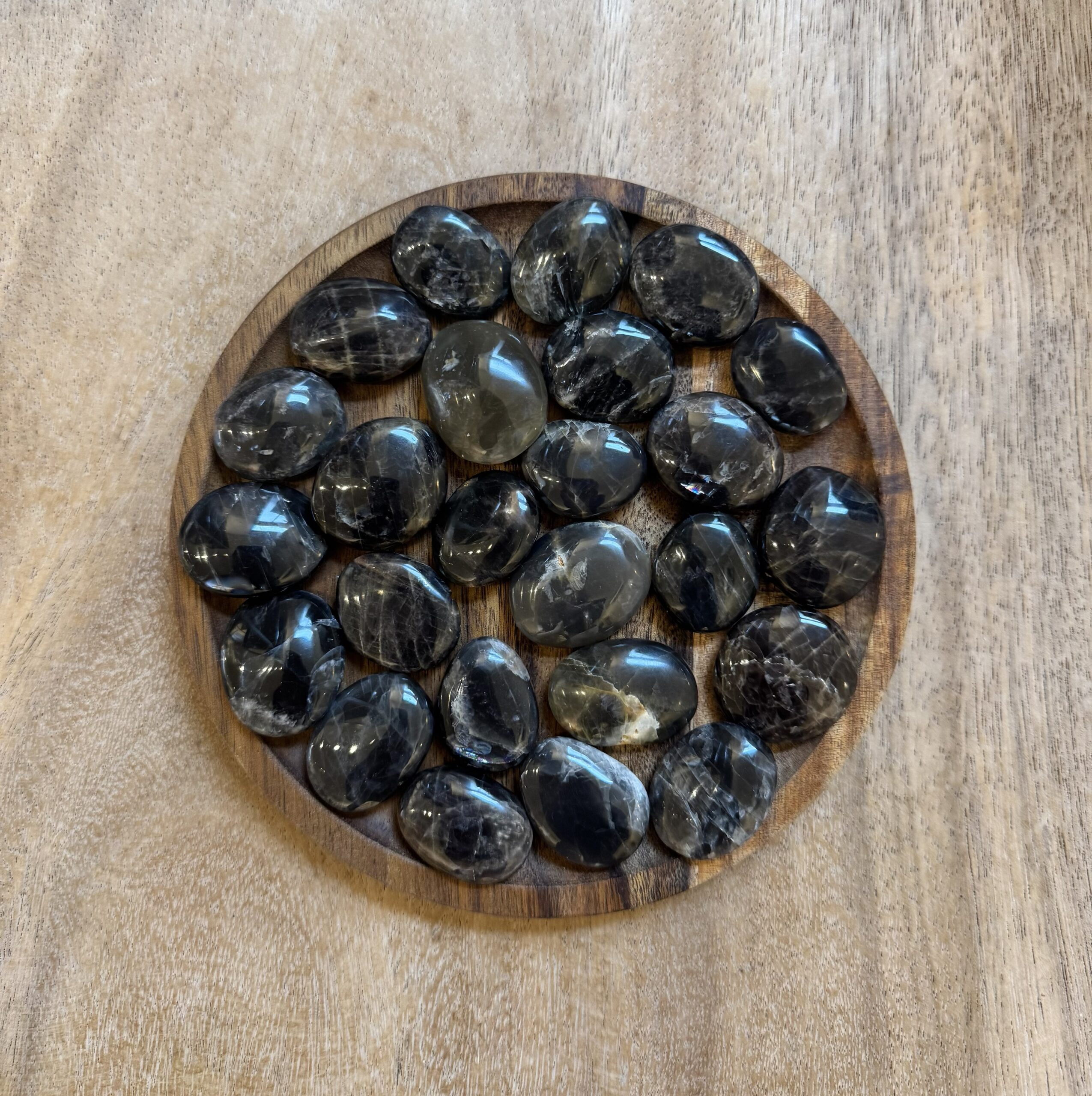 Zwarte Maansteen is een vrouwensteen en heeft een sterke connectie met de maan. Deze steen ondersteunt bij alle aspecten van kinderen krijgen, zwanger worden, zwangerschap, bevalling en kraamtijd. Tevens om meer flow te krijgen in je vrouwelijke energie. Deze steen brengt je manlijke en vrouwelijke energie met elkaar in evenwicht. Zwarte Maansteen kalmeert het gevoelsleven en bevordert de intuïtie. Zwarte maansteen werkt dieper in op het onderbewustzijn en helpt je om verborgen emoties, patronen en angsten te herkennen en te transformeren. Het is een steen van zelfreflectie, innerlijke groei en intuïtieve kracht. Deze steen ondersteunt het verwerken van oude emoties en trauma’s, vooral die welke onbewust nog invloed uitoefenen op je gedrag of gevoelens. Het helpt je om emoties niet te onderdrukken maar om ze op een liefdevolle manier te erkennen en los te laten. Hierdoor kan er ruimte ontstaan voor acceptatie, heling en persoonlijke ontwikkeling. Zwarte Maansteen moedigt aan om stil te worden, naar binnen te keren en vanuit rust en intuïtie te handelen. Zwarte Maansteen werkt krachtig op het derde oog en het kruinchakra en stimuleert daarmee de intuïtie, helderziendheid, lucide dromen en mediamieke gaven. Tegelijkertijd zorgt de donkere energie van deze steen ervoor dat je goed geaard blijft. Dit maakt het een veilige en stabiele begeleider bij spiritueel werk, droomwerk, meditatie en het contact maken met hogere dimensies of gidsen.